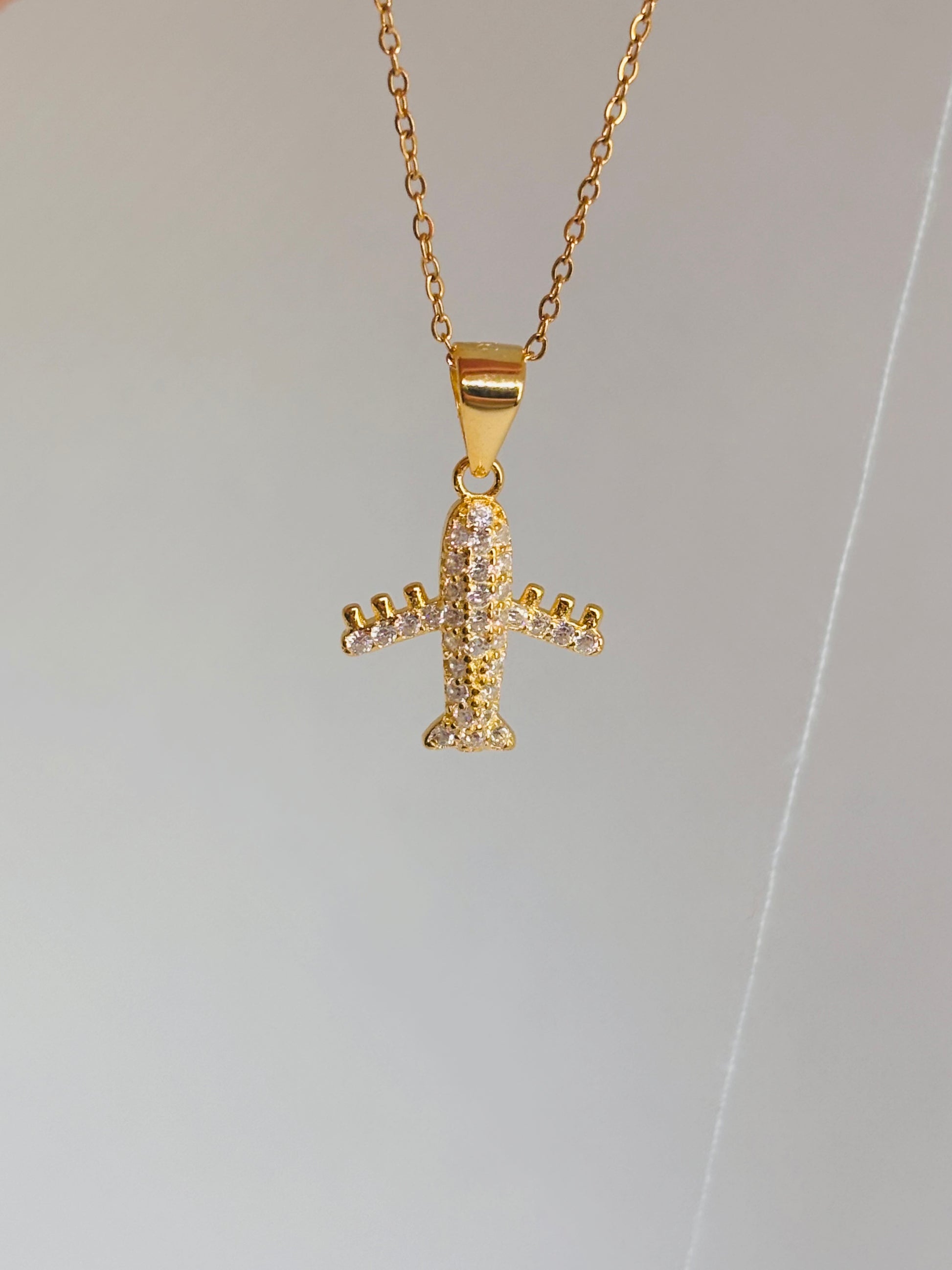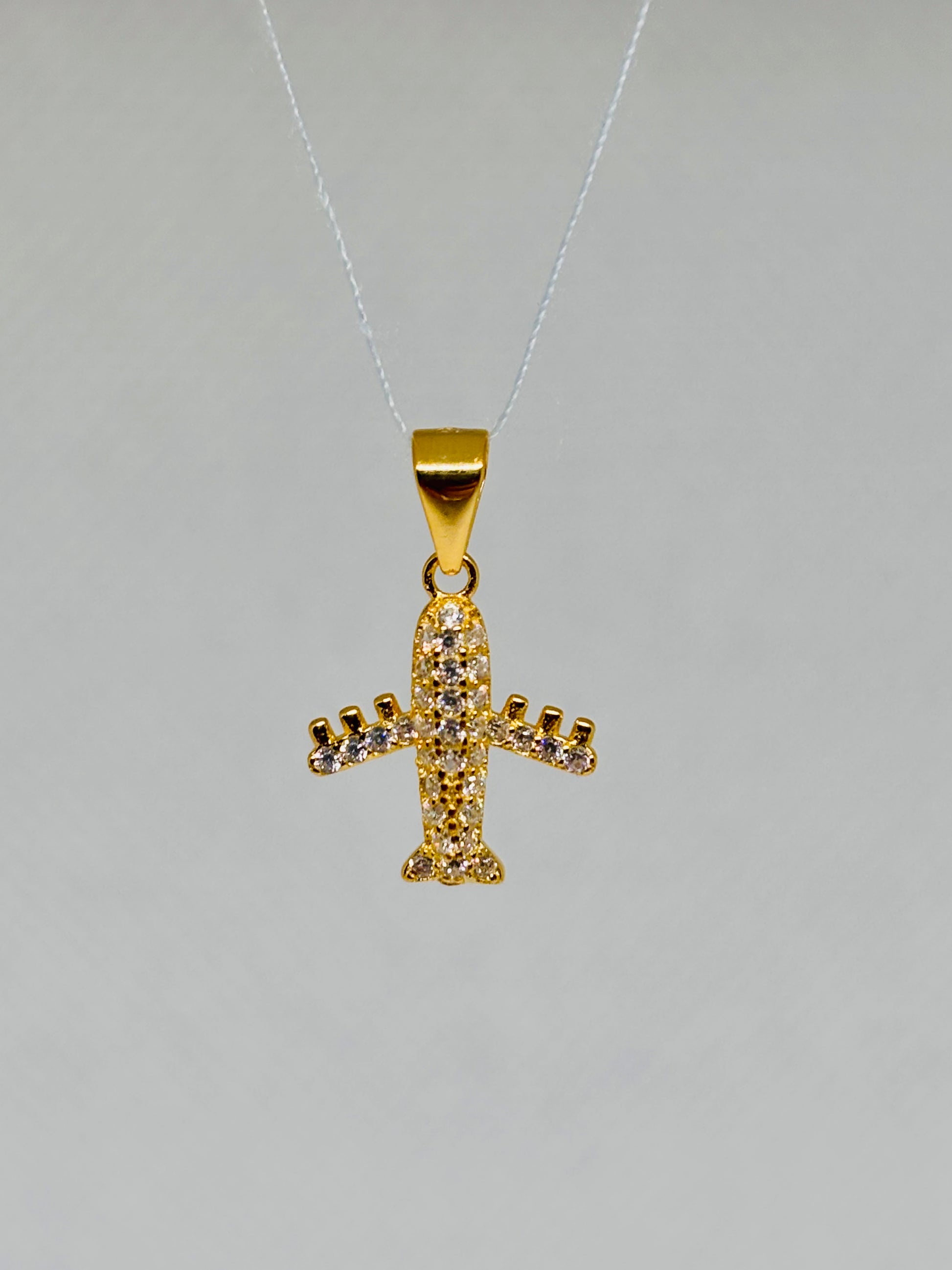 Ciondolo in argento 925/1000 dorato a forma di aeroplano. I suoi zirconi incastonati interamente nell’aereo rendono i suoi riflessi dorati accattivanti.
