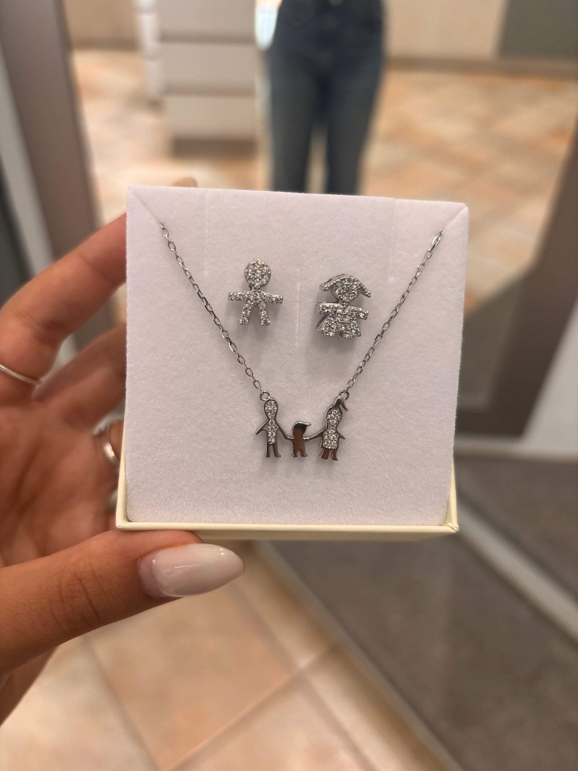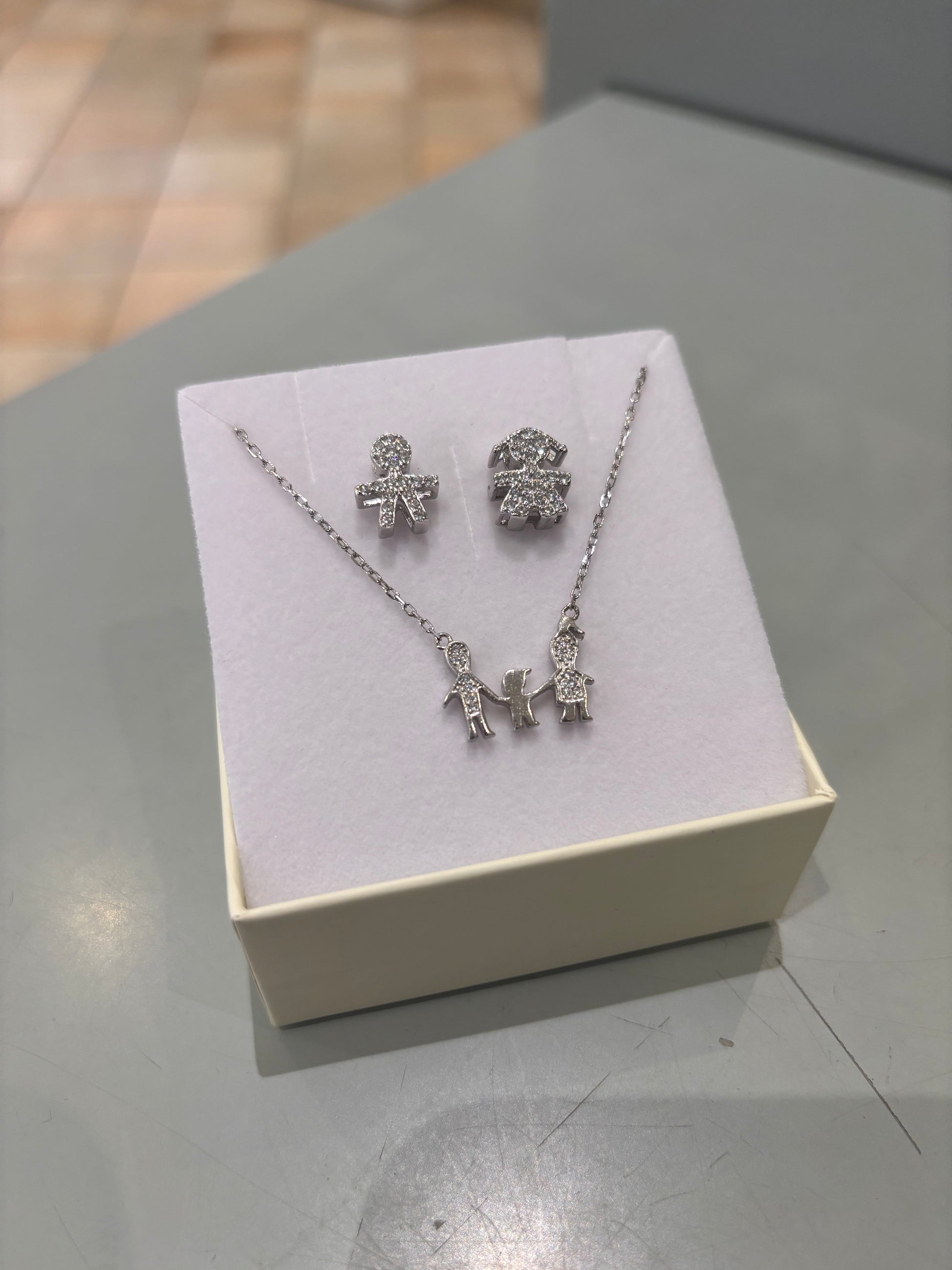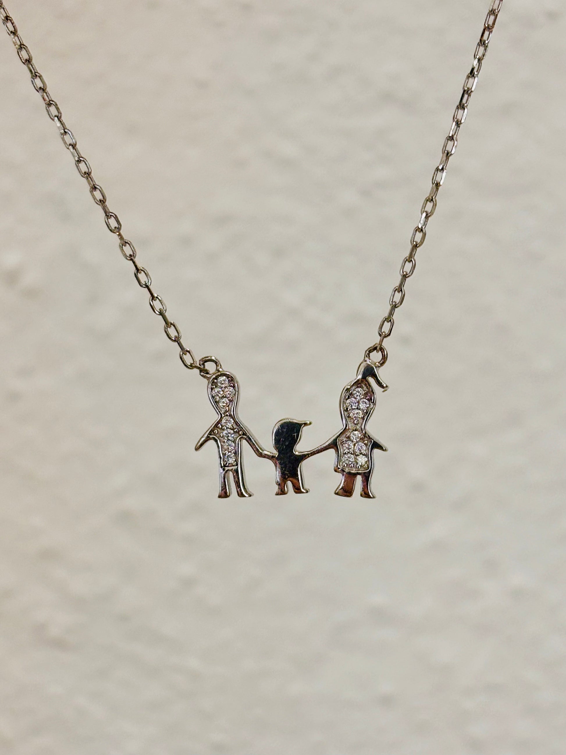 Collana in argento raffigurante la famiglia, mamma papà e bimbo impreziosita da zirconi