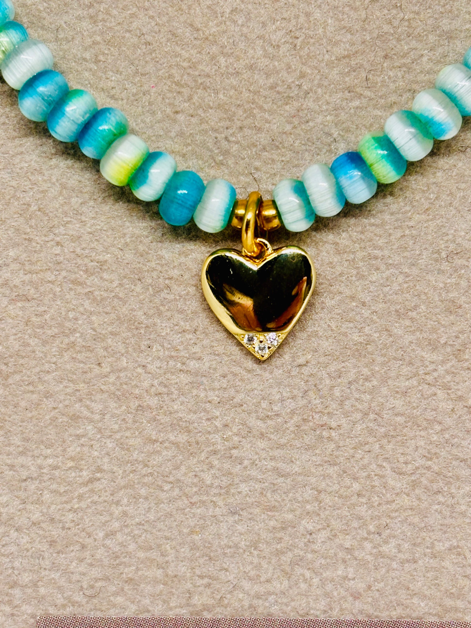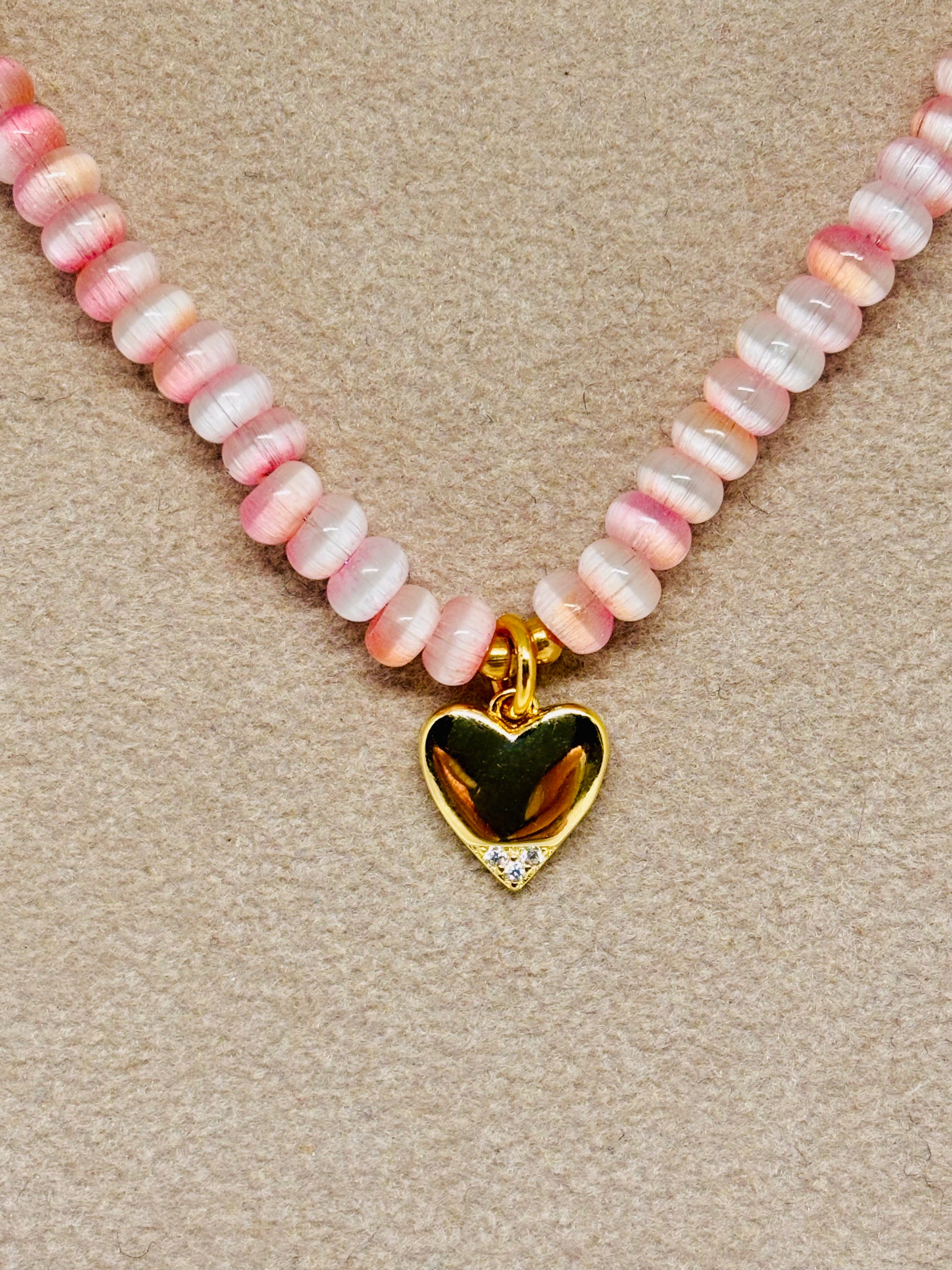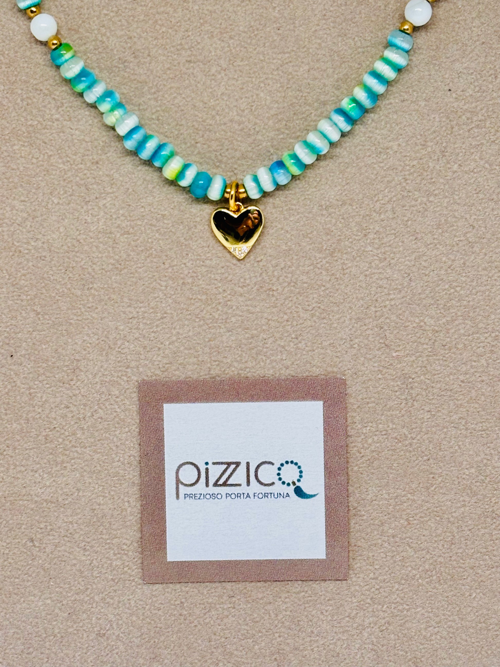 Collana dai colori tenui pastello in cristallo con inserti in acciaio gold e cuore in argento 925/1000 gold impreziosì da zirconi.